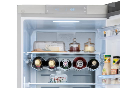 - Rack de bebidas: armazena 5 grandes garrafas, liberando espaço nas prateleiras da porta.