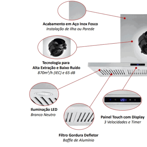 - Acabamento sofisticado: Aço inox fosco, instalação em ilha ou parede.