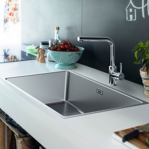 Descubra as cubas de aço inox da "Franke", disponíveis com e sem acessórios. Os cantos retos conferem modernidade e imponência à sua cozinha.
