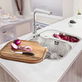 Os acessórios são projetados para se integrar à cuba, oferecendo praticidade no dia a dia. Inclui um cesto escorredor aramado, uma tábua de preparação em madeira e um cesto escorredor em inox. 🥗