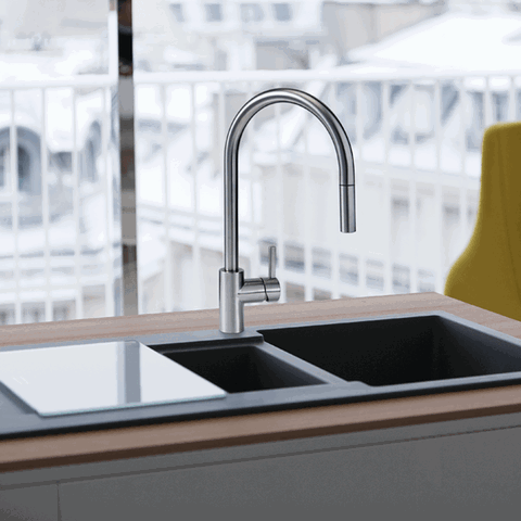 A bica extensível em J oferece alcance e mobilidade excepcionais, enquanto o monocomando permite ajustar facilmente a vazão e temperatura da água, seja quente ou fria. 💧